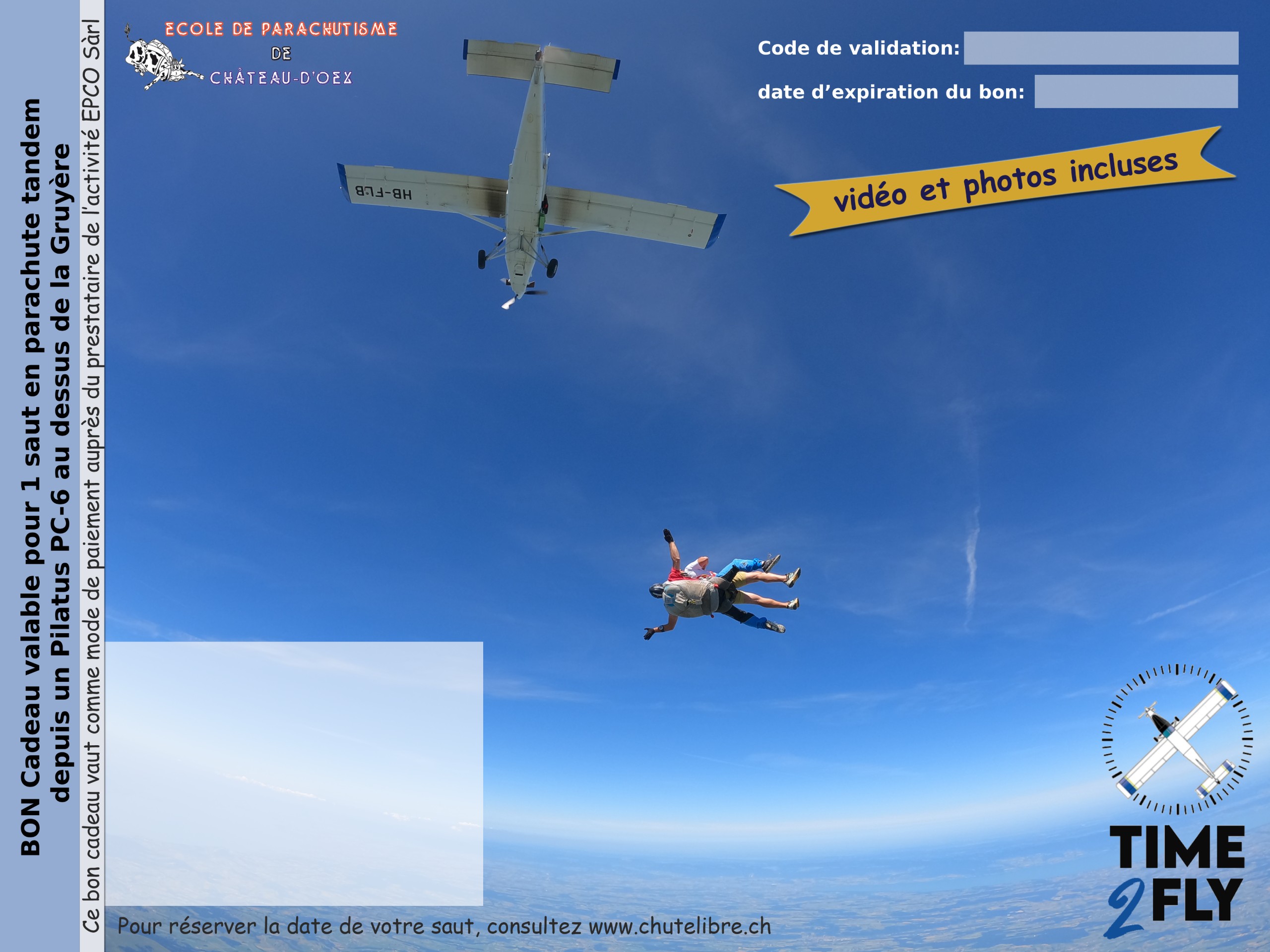 Offrez un Bon Cadeau pour un baptême de saut en parachute depuis notre avion, au-dessus de la Gruyère ou au-dessus du lac de Neuchâtel. (selon les dates disponibles)